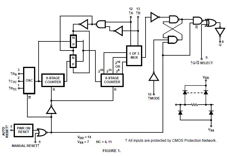 The CD4541 is a programmable timer. It consists of a 16-stage binary counter, an oscillator that is controlled by external R-C components (2 resistors and a capacitor), an automatic power-on reset circuit, and output control logic. The counter of CD4541 increments on positive-edge clock transitions and can also be reset via the MASTER RESET input.